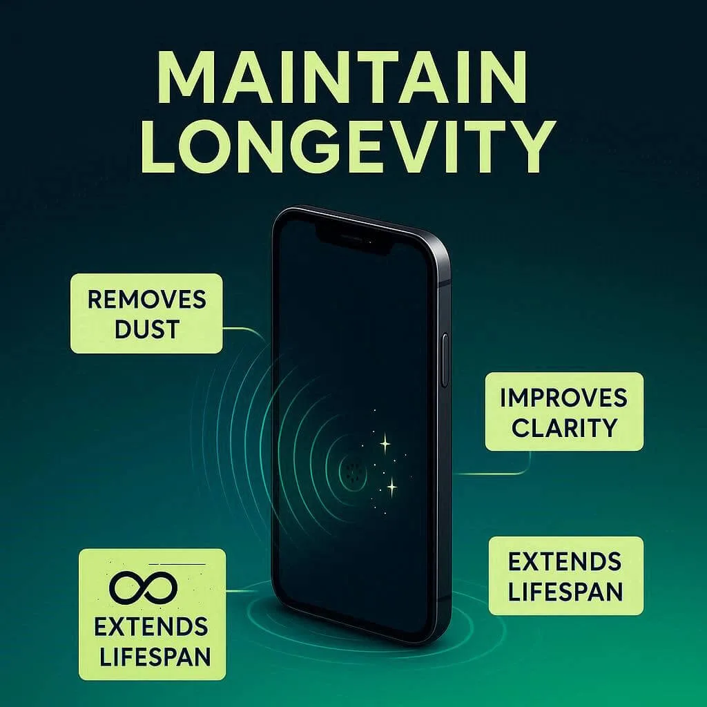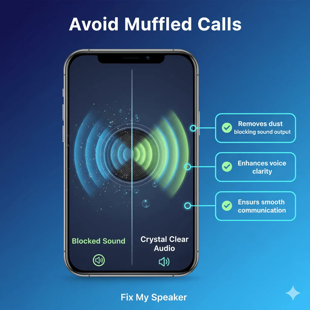 Dust particles stuck on the internal speaker that can cause muffled sound and unclear audio or video calls. It uses low and high frequency waves to create micro vibrations.