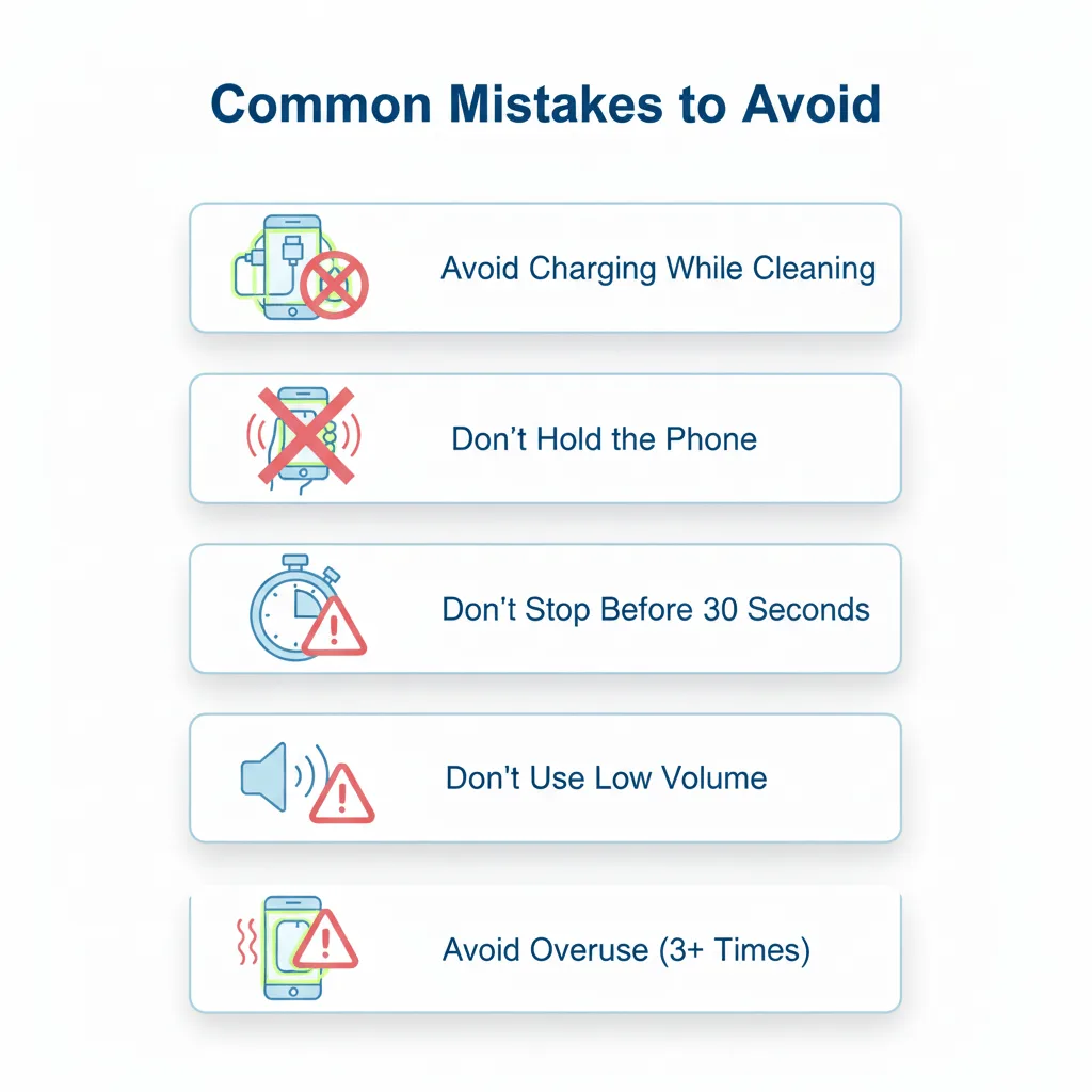 - Remove the Phone’s Cover: It can cause heating and block the sound waves during the cleaning process.