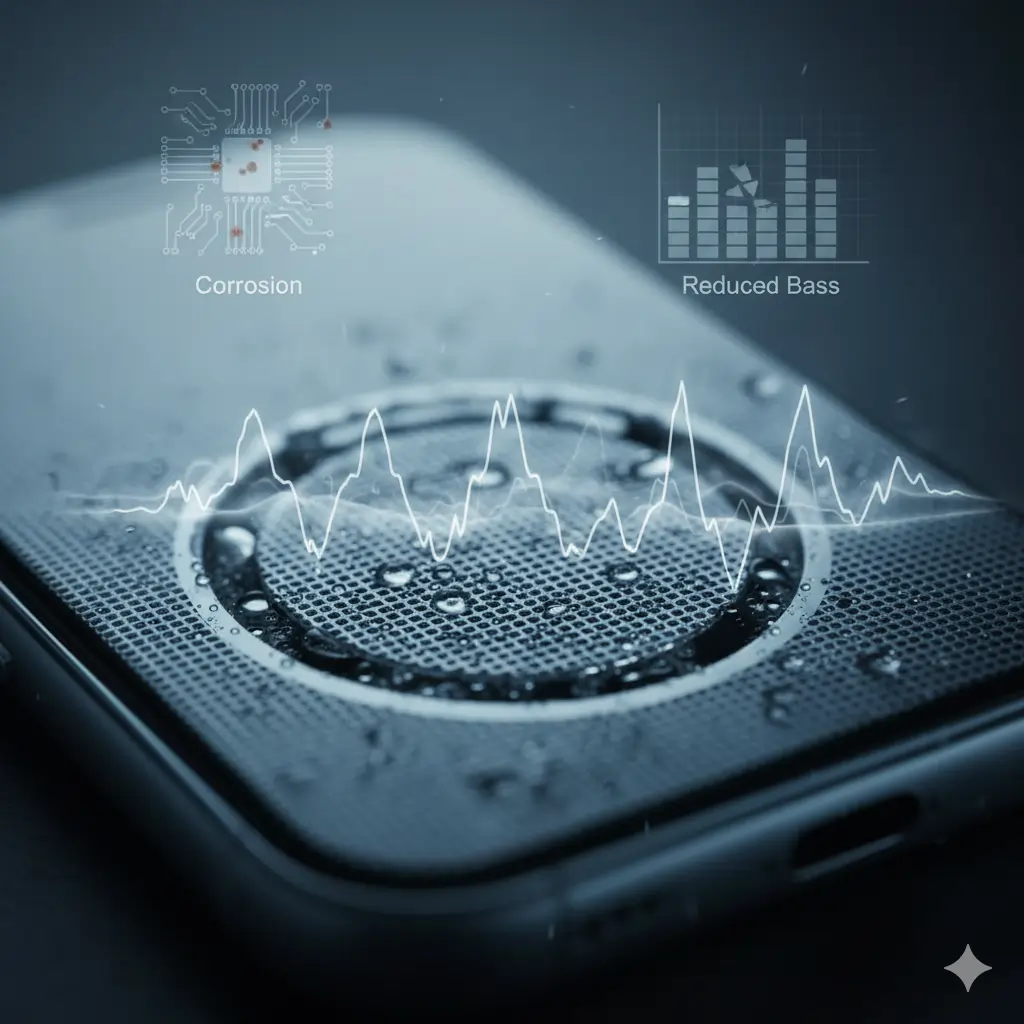 When water seeps into your speaker vents, it affects how sound waves travel through the tiny mesh. This causes: