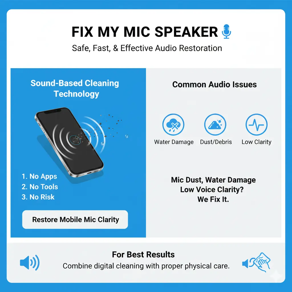 Whether you’re dealing with mic dust, water in phone speaker sound, or low voice clarity, Fix My Mic Speaker offers a safe, fast, and effective solution. Using sound-based cleaning technology, you can restore mobile mic clear sound without apps, tools, or risk. For ongoing issues, combine digital cleaning with proper physical care for best results.