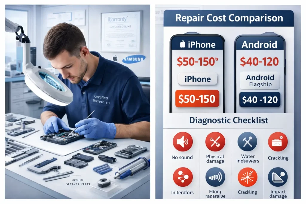 Repair Cost Expectations: iPhone speaker replacement: $50-$150 depending on model. Android flagship models: $40-$120 for speaker replacement. Budget Android phones: Sometimes cheaper replacing entire device than repairing.