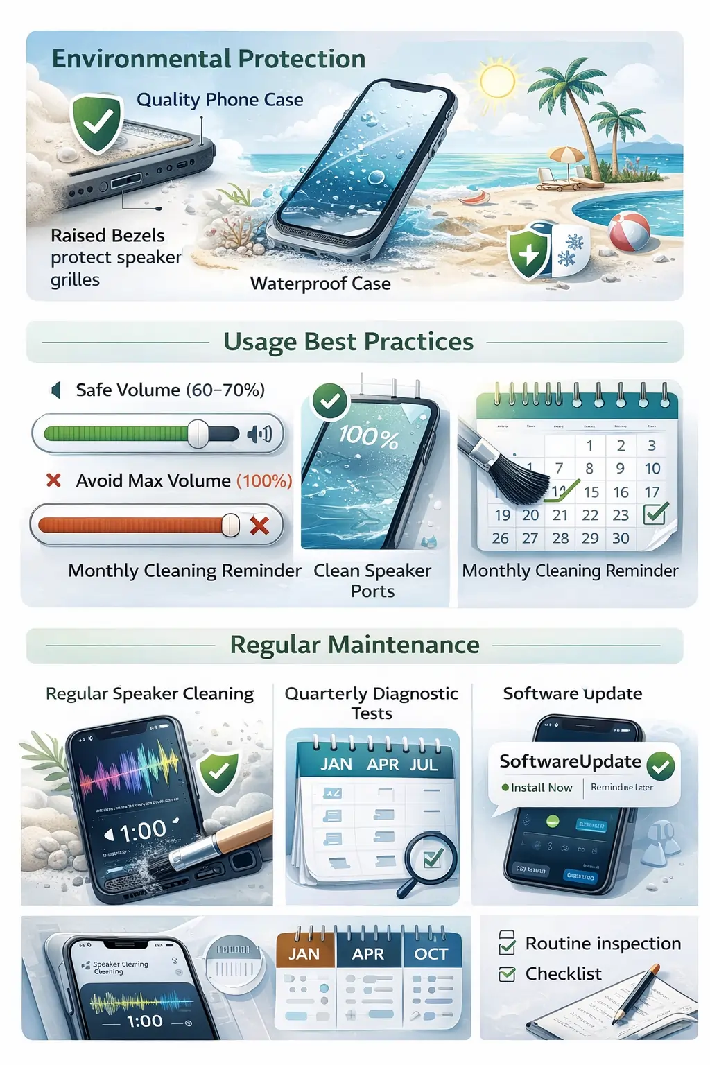 Usage Best Practices: Avoid maximum volume for extended periods, as this strains speaker cones. Clean speaker grilles monthly using soft brushes. Keep phones out of pockets with lint and debris. Use screen protectors extending over speaker areas when possible.