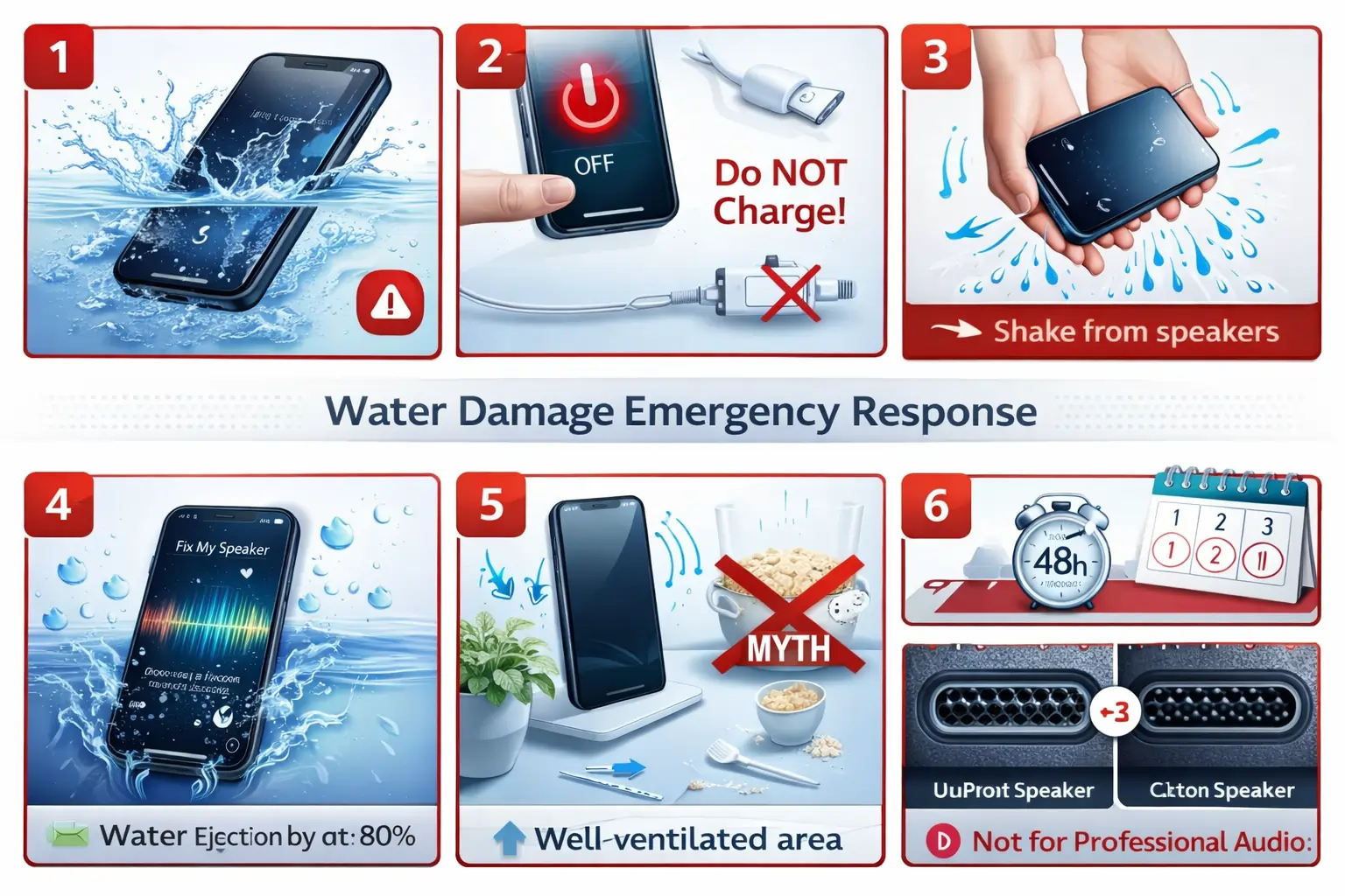 Power off the device completely to prevent short circuits. Don’t charge wet phones. Gently shake excess water from speaker grilles. Use speaker cleaning frequency apps to vibrate remaining water out. Place phone in dry, well-ventilated area (not rice, which doesn’t help and leaves debris).
