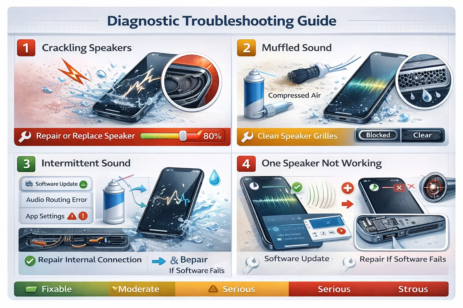 Muffled Sound: Muffled audio almost always stems from blocked speaker grilles. Aggressive cleaning with compressed air and soft brushes resolves most cases. Persistent muffling after cleaning suggests water damage or damaged speaker components.